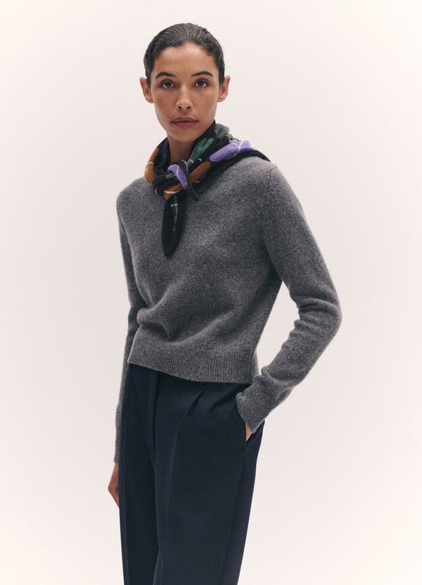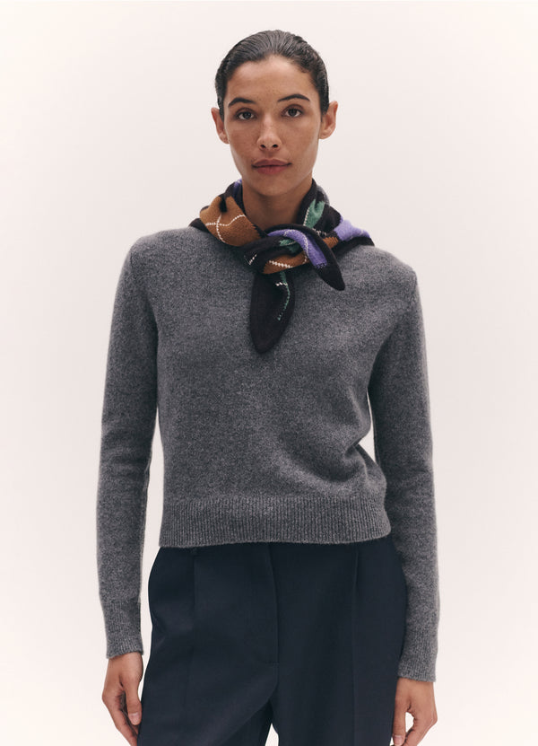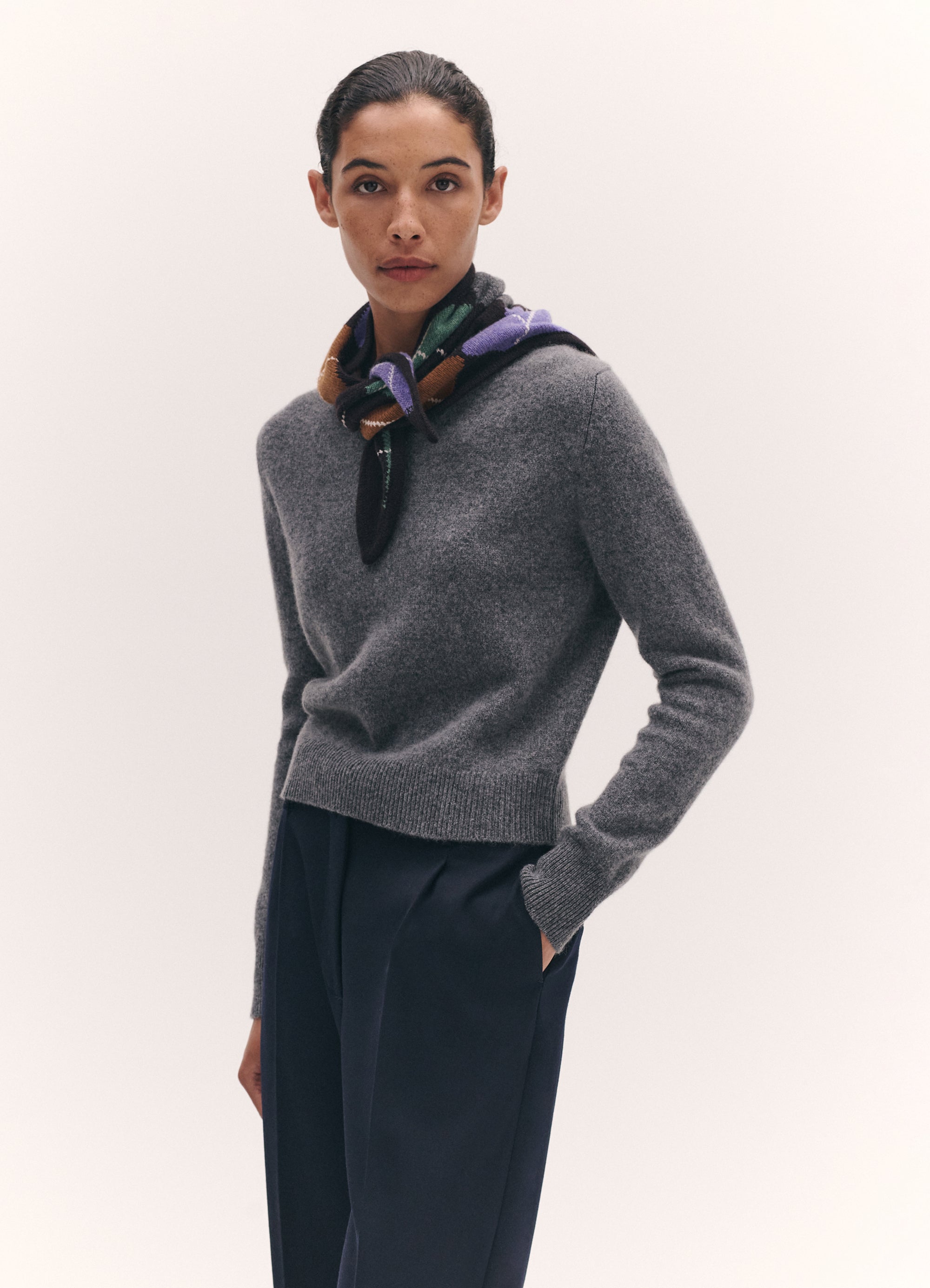 Maya is wearing the Argyle Cashmere Foulard in Dark Brown and Heather styled with the Sligo V-Neck in Derby Grey.