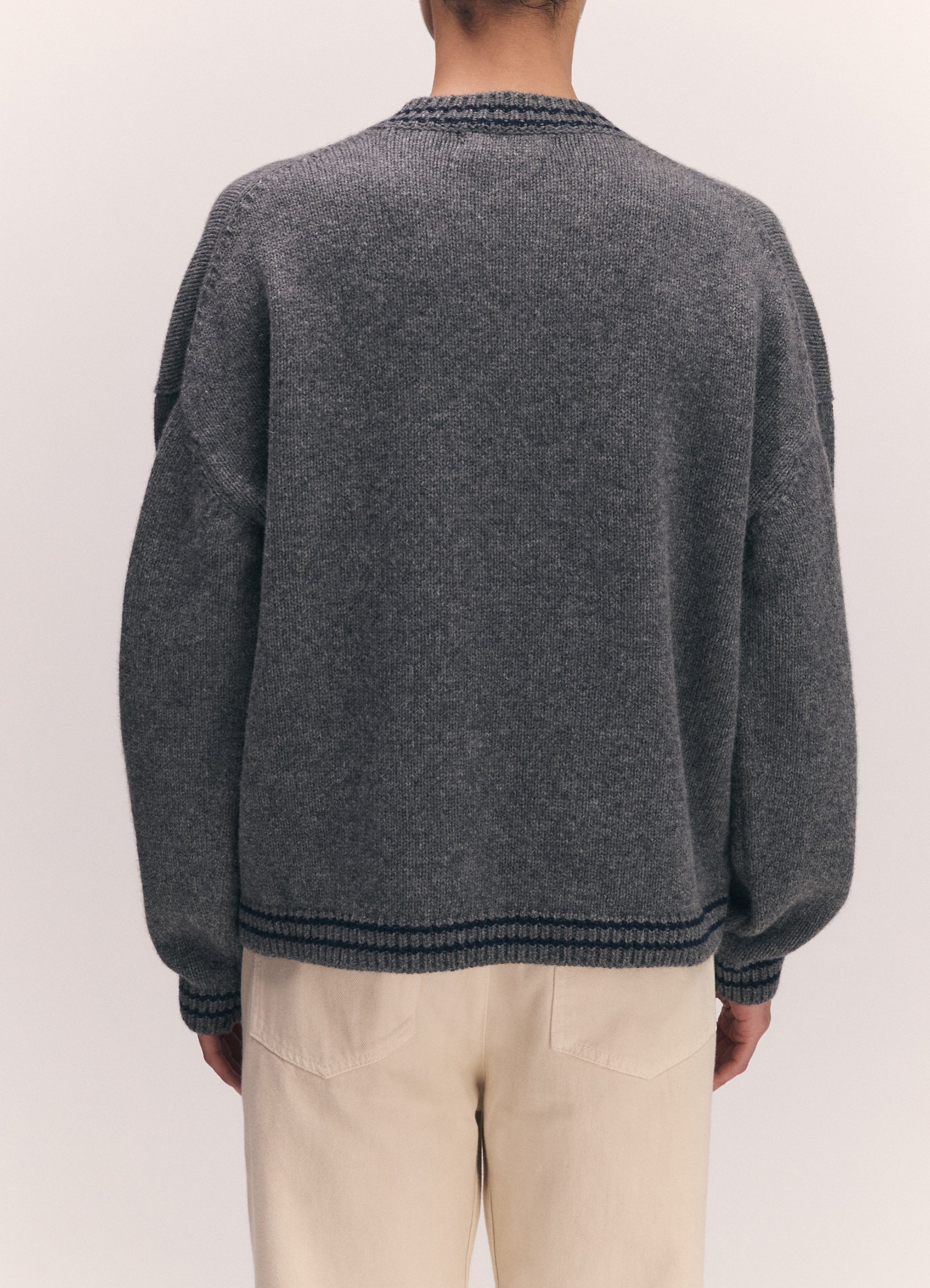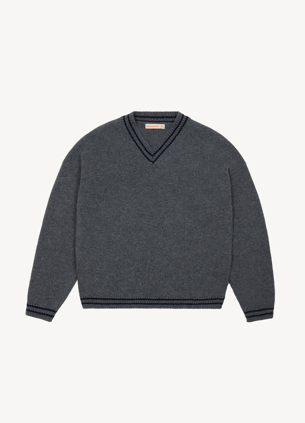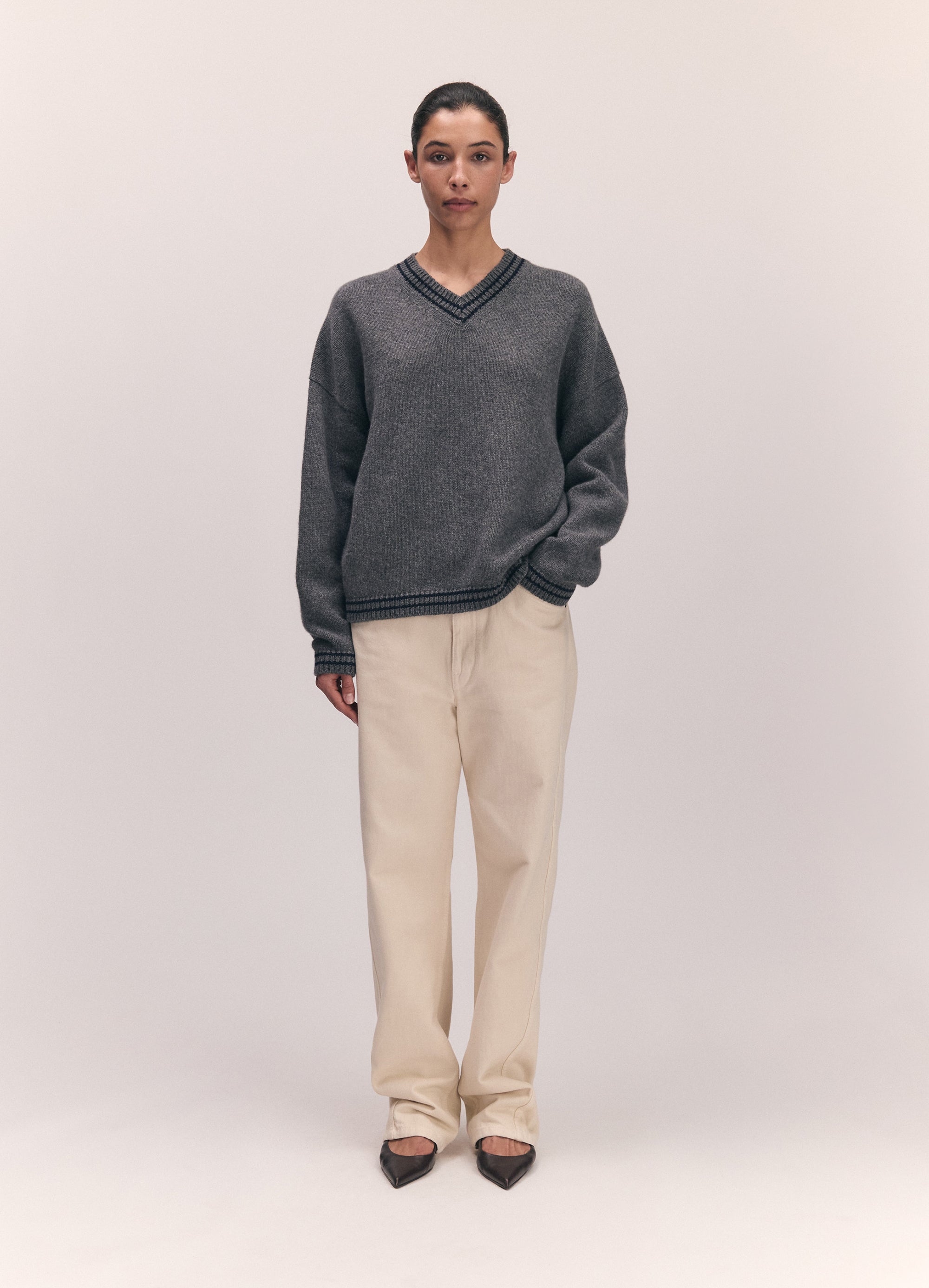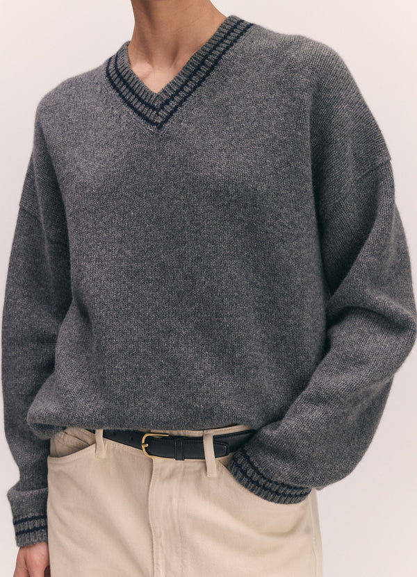 The Balla Slouch V-Neck in super-soft geelong lambswool. The soft elegance of a boyish V-neck collar is finished with a subtle navy stripe trim, giving this classic shape a gently graphic edge. Knitted in a chunky 5-gauge weight for a beautifully soft hand-feel and tactile warmth, the silhouette is subtly draped and gently oversized for easy, everyday wear.