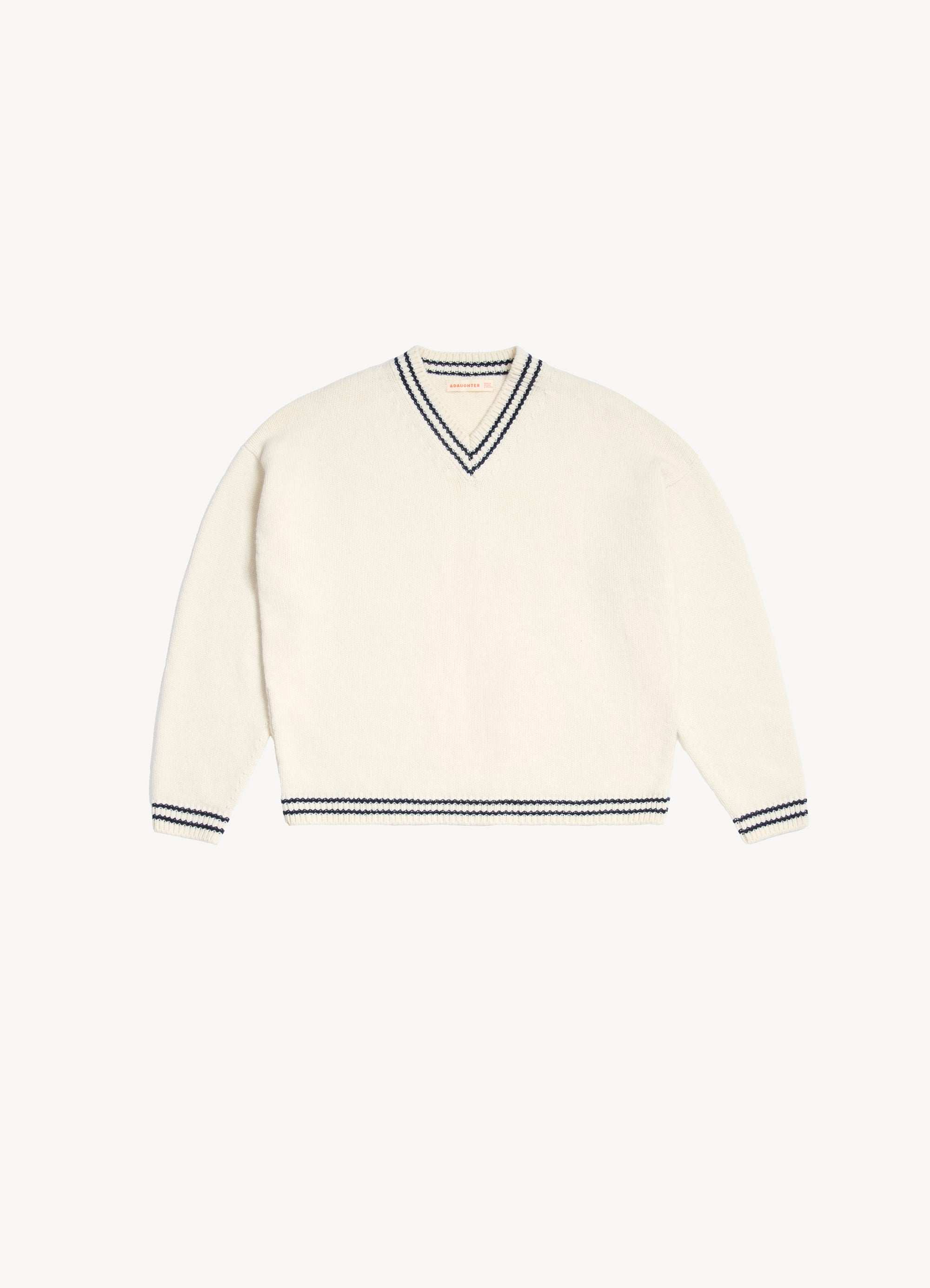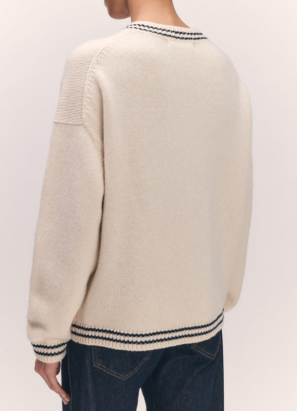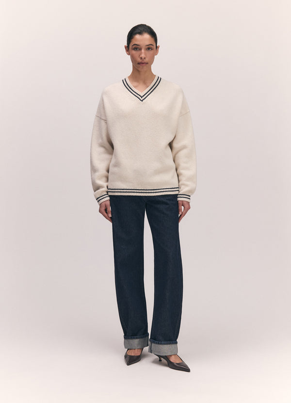 The Balla Slouch V-Neck in super-soft geelong lambswool. The soft elegance of a boyish V-neck collar is finished with a subtle navy stripe trim, giving this classic shape a gently graphic edge. Knitted in a chunky 5-gauge weight for a beautifully soft hand-feel and tactile warmth, the silhouette is subtly draped and gently oversized for easy, everyday wear.