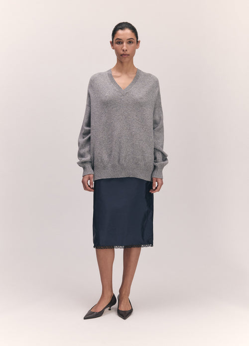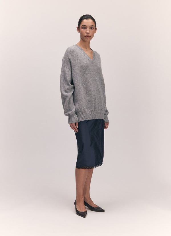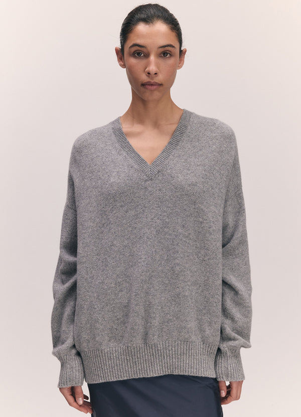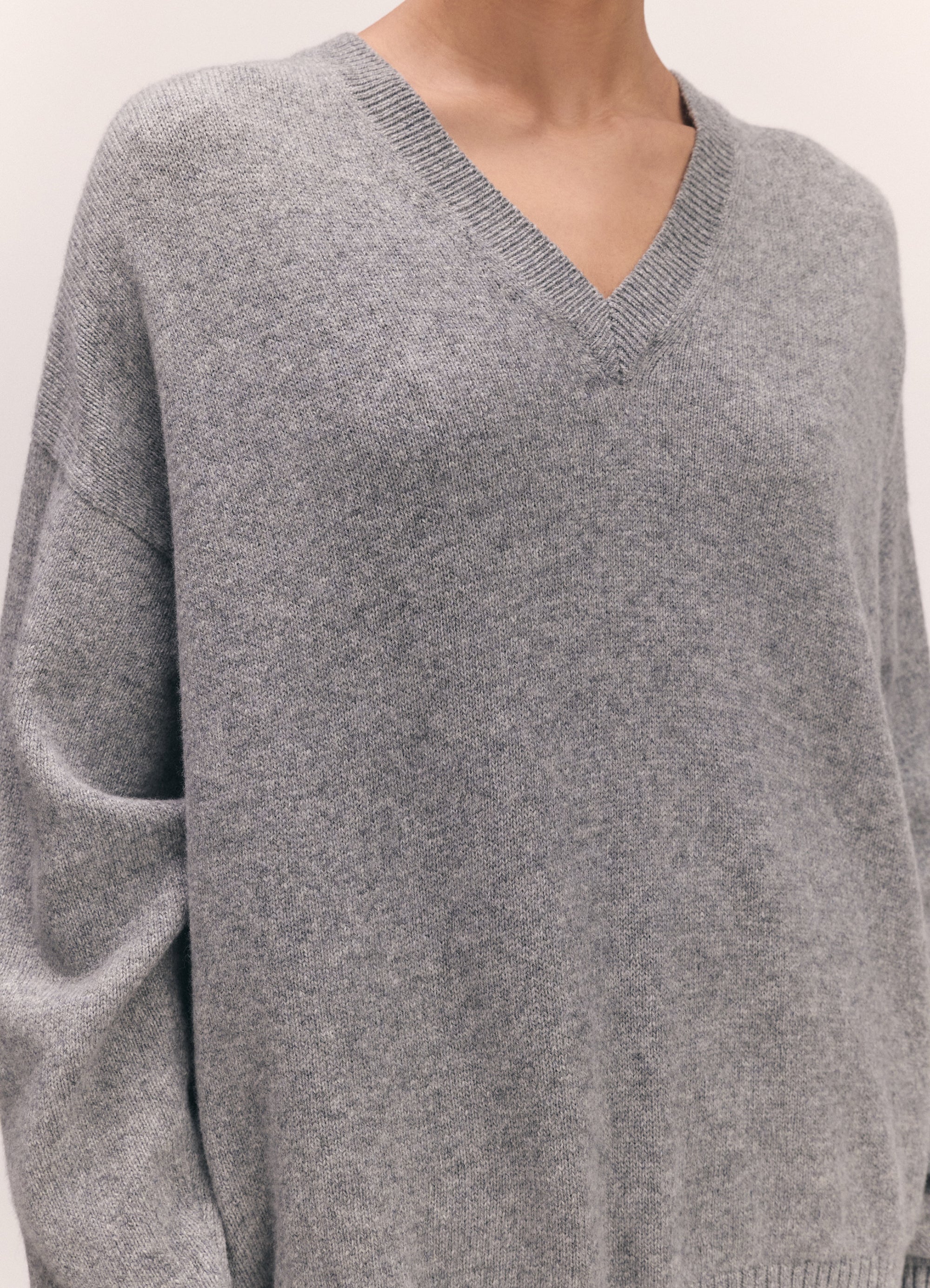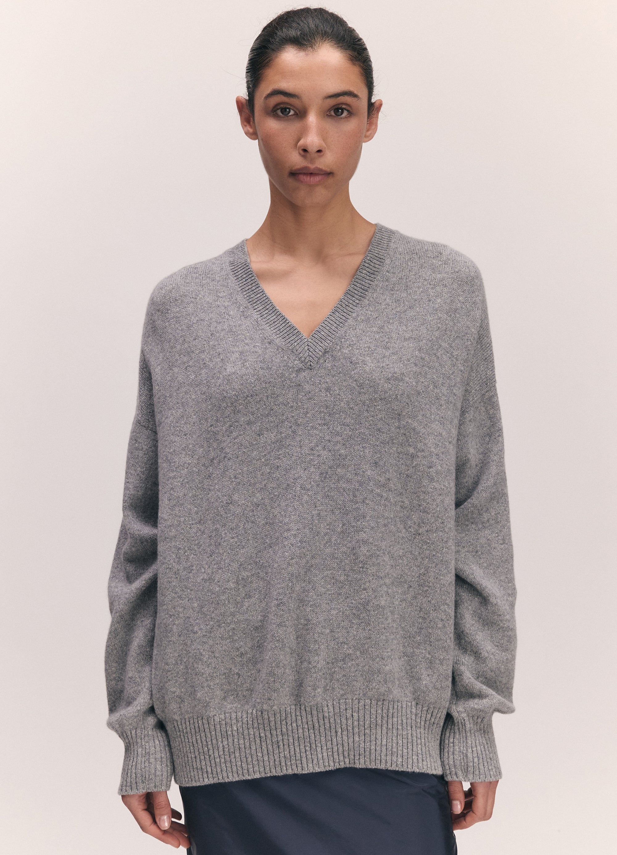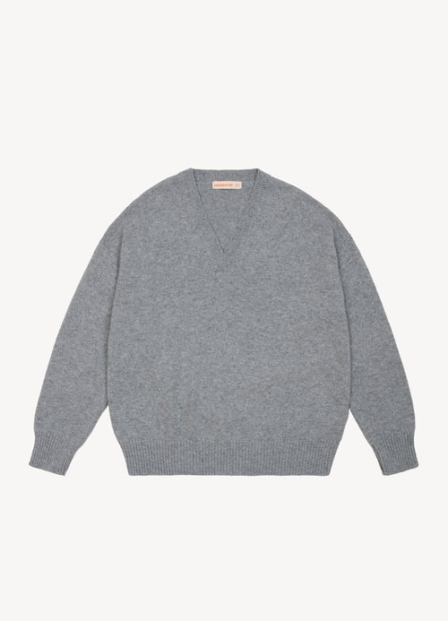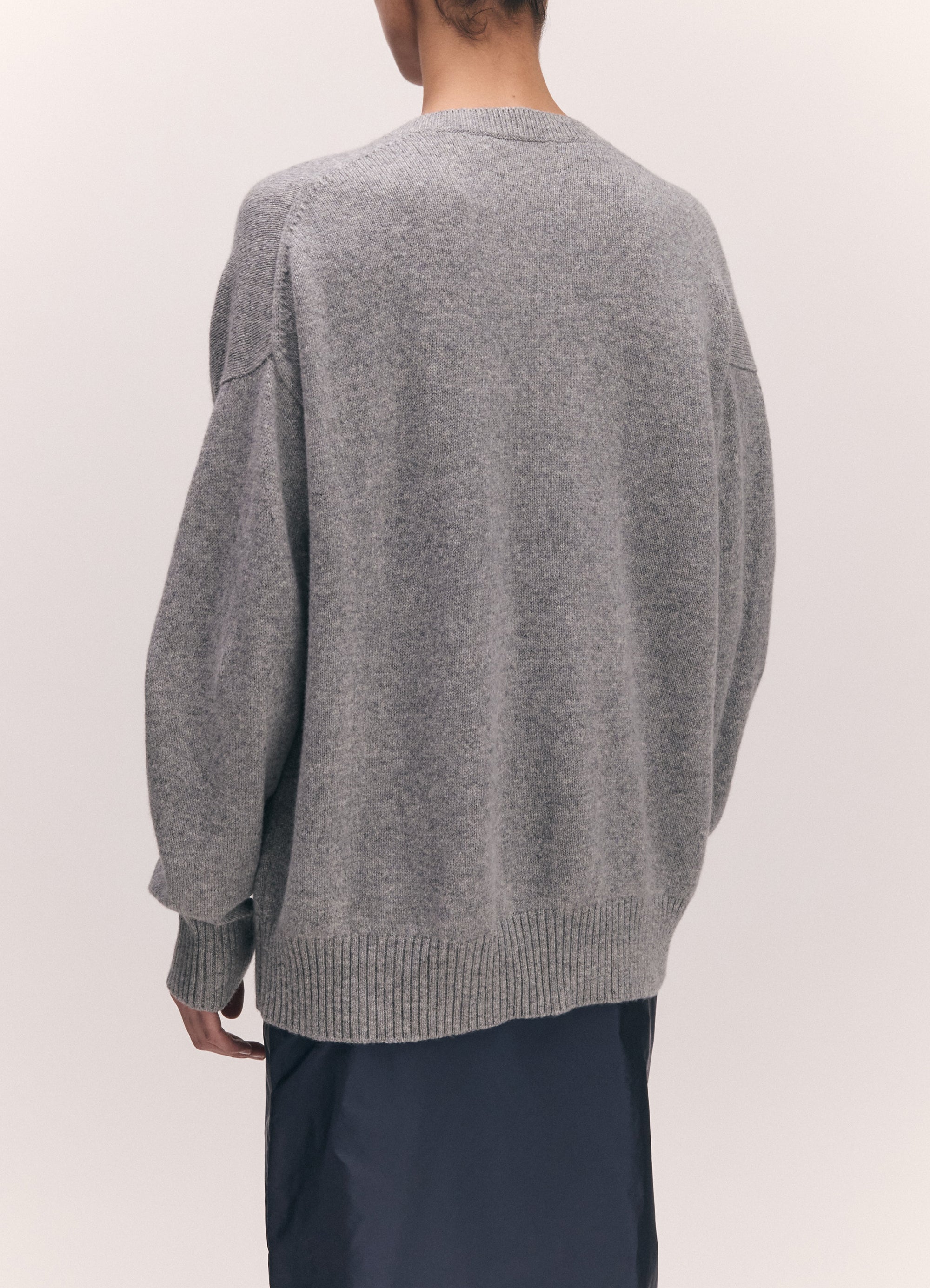 Knitted in a mid-weight 7-gauge lambswool, the silhouette is gently oversized with a slouchy, easy drape designed for everyday wear. Finished with a clean V-neckline and ribbed trims, it’s a versatile piece that layers effortlessly or stands alone.