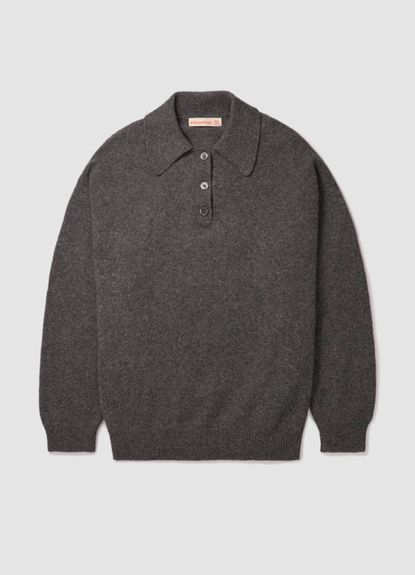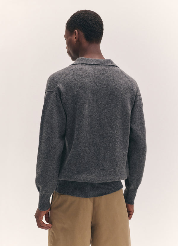 In soft Scottish-spun lambswool, the Edith Polo Shirt is vintage sports-inspired, in derby grey. In a soft-silhouette with a slight dropped shoulder for subtle drape. Finished with rib cuff and collar and trocas shell buttons.