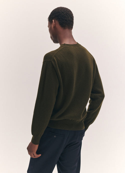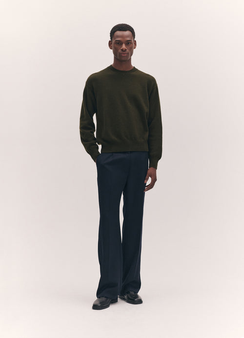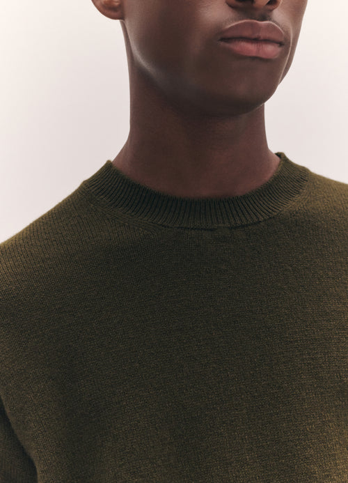 Godwin wears the Mens Innes Slouch Crewneck in Military Green styled with the Fairisle Cashmere Foulard in Dark Natural.