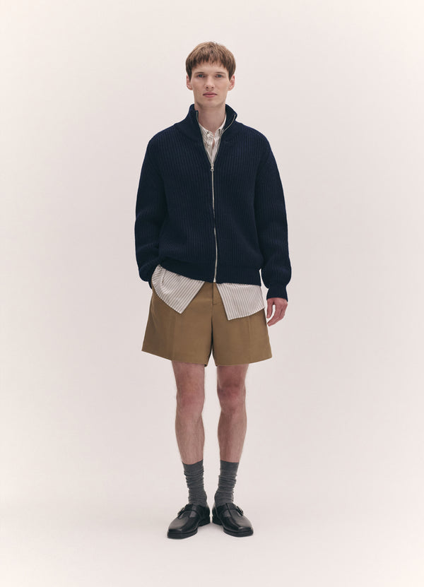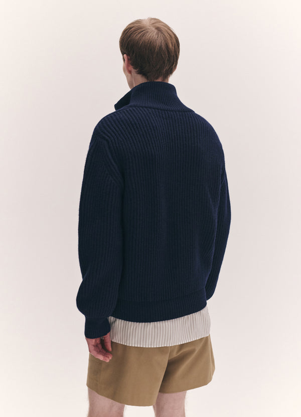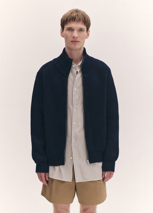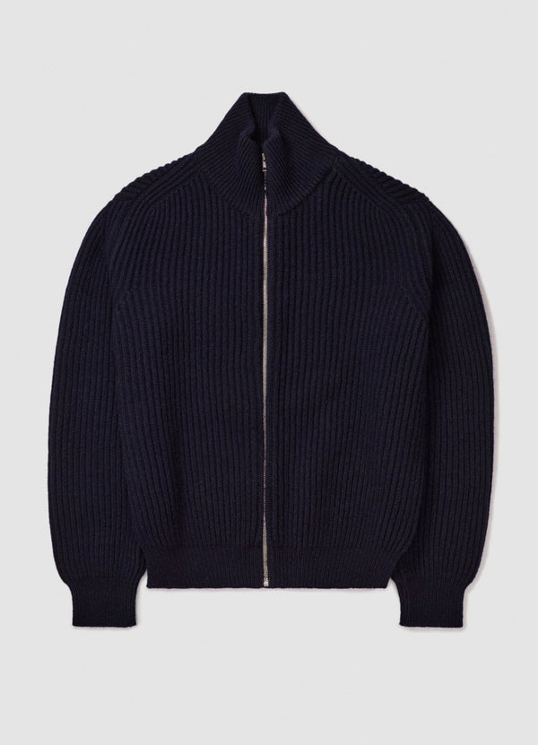 The Rea Rib Jacket in Dark Navy. Knitted in Responsible Wool Standard certified lambswool, in a chunky knit, textured rib stitch with zip-through front and high rib collar. With a drop shoulder and gently slouched proportions for a sense of comfort and ease.