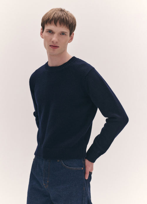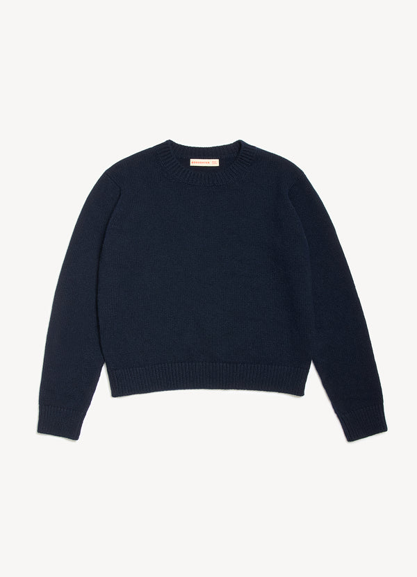 The Rosha Shrunken Crewneck in Navy is crafted in a chunky 5-gauge weight for a beautifully soft hand-feel and tactile warmth. With a subtly shrunken fit with traditional saddle shoulder detail.