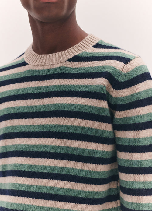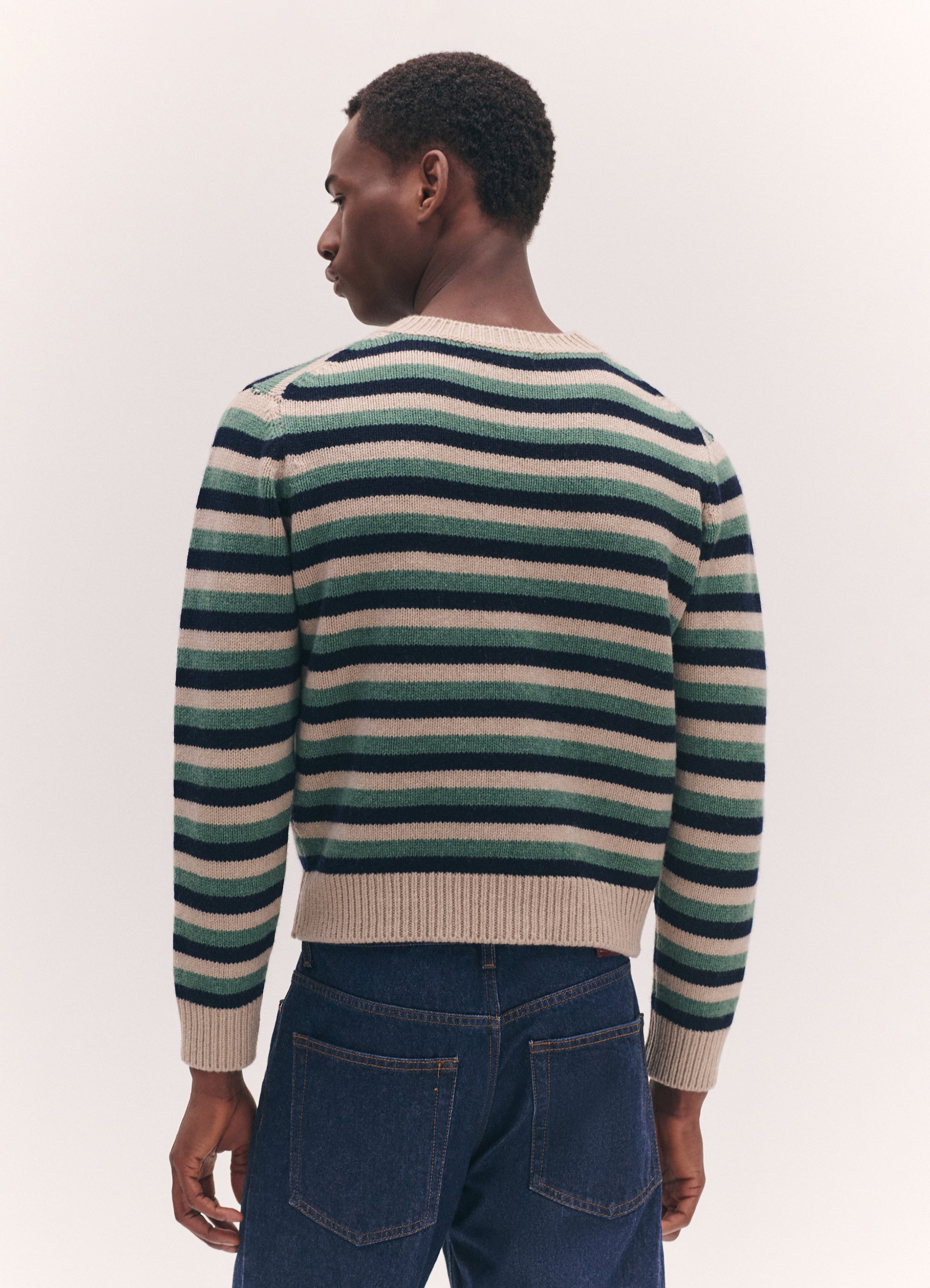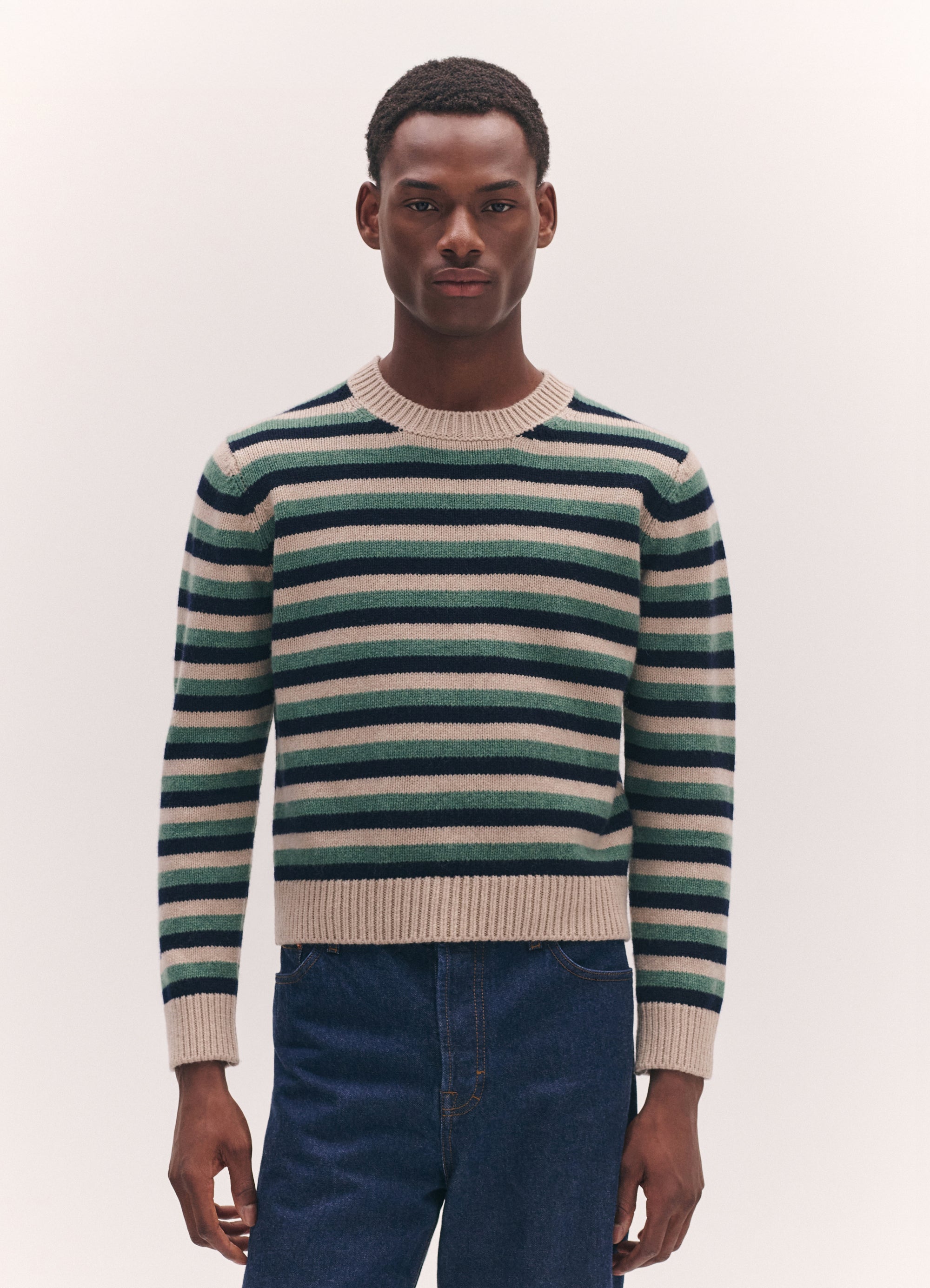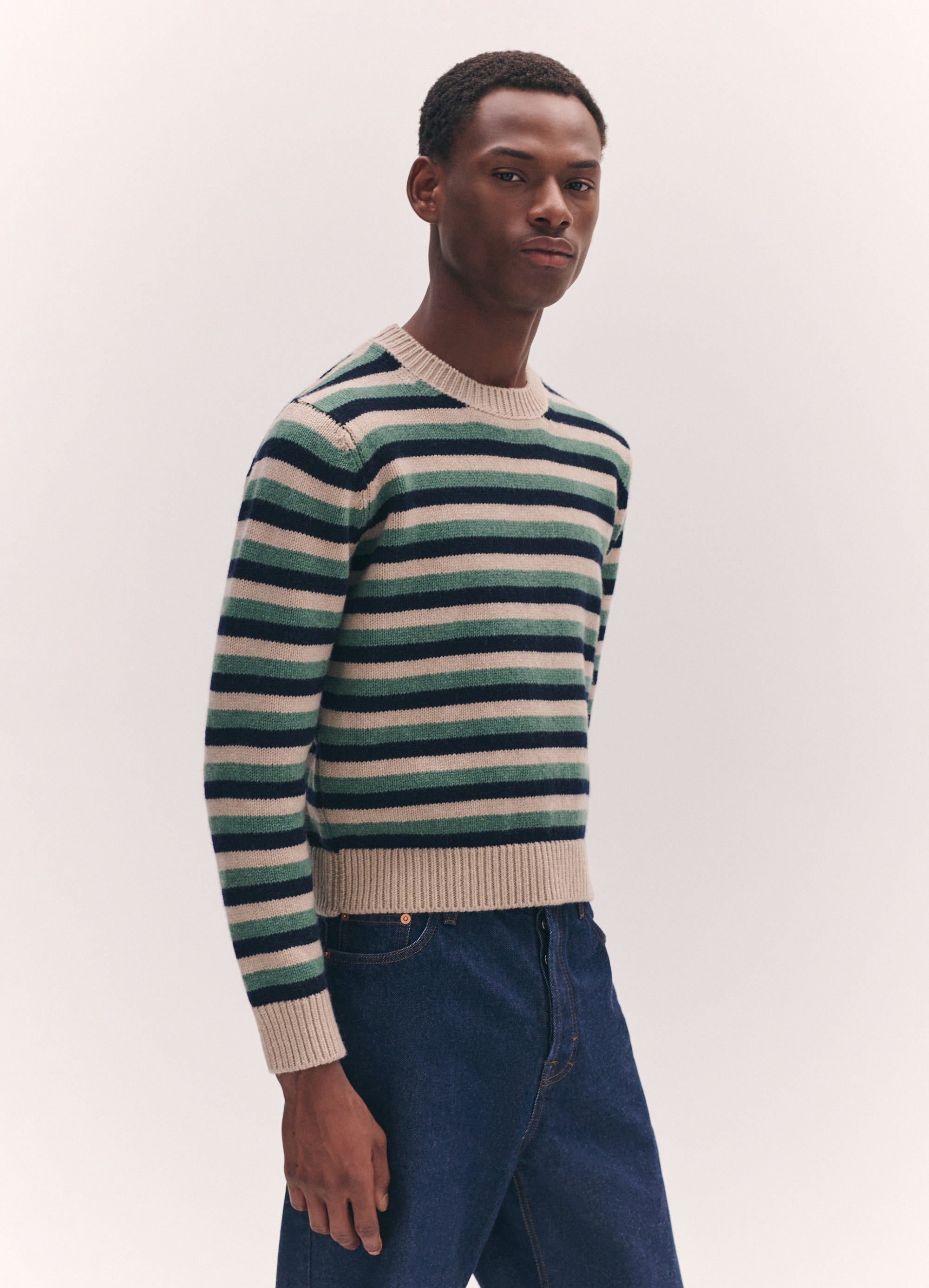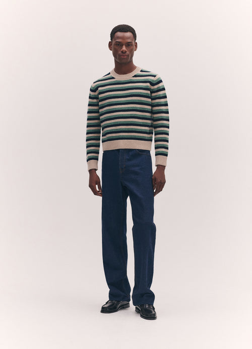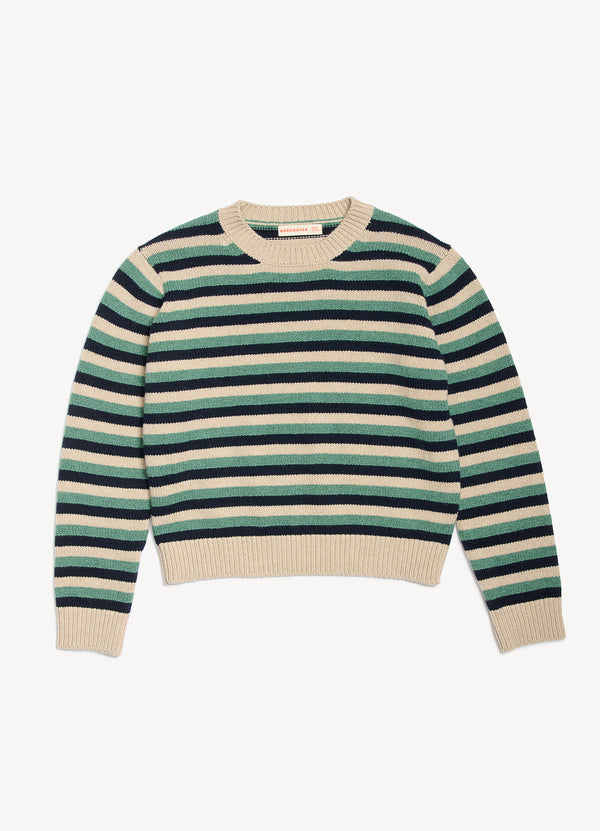 The Rosha Shrunken Crewneck in Strath, Navy and Oatmeal Stripe is crafted in a chunky 5-gauge weight for a beautifully soft hand-feel and tactile warmth. With a subtly shrunken fit with traditional saddle shoulder detail.