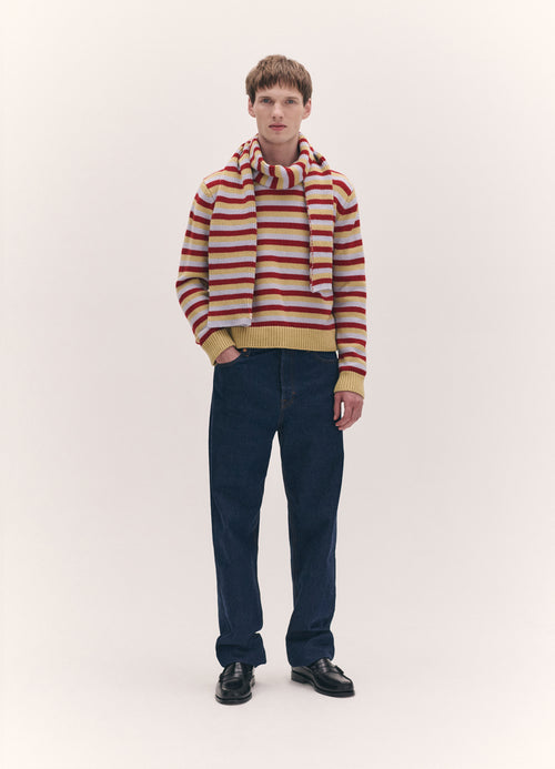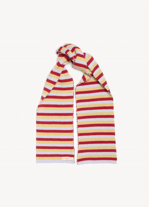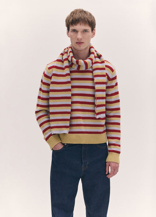 The Striped Cashmere Scarf in Ruby Red, Acacia Yellow and Dust Blue Stripe. A classic style made from super soft geelong lambswool, featuring ribbed detailing throughout. The perfect winter accessory.
