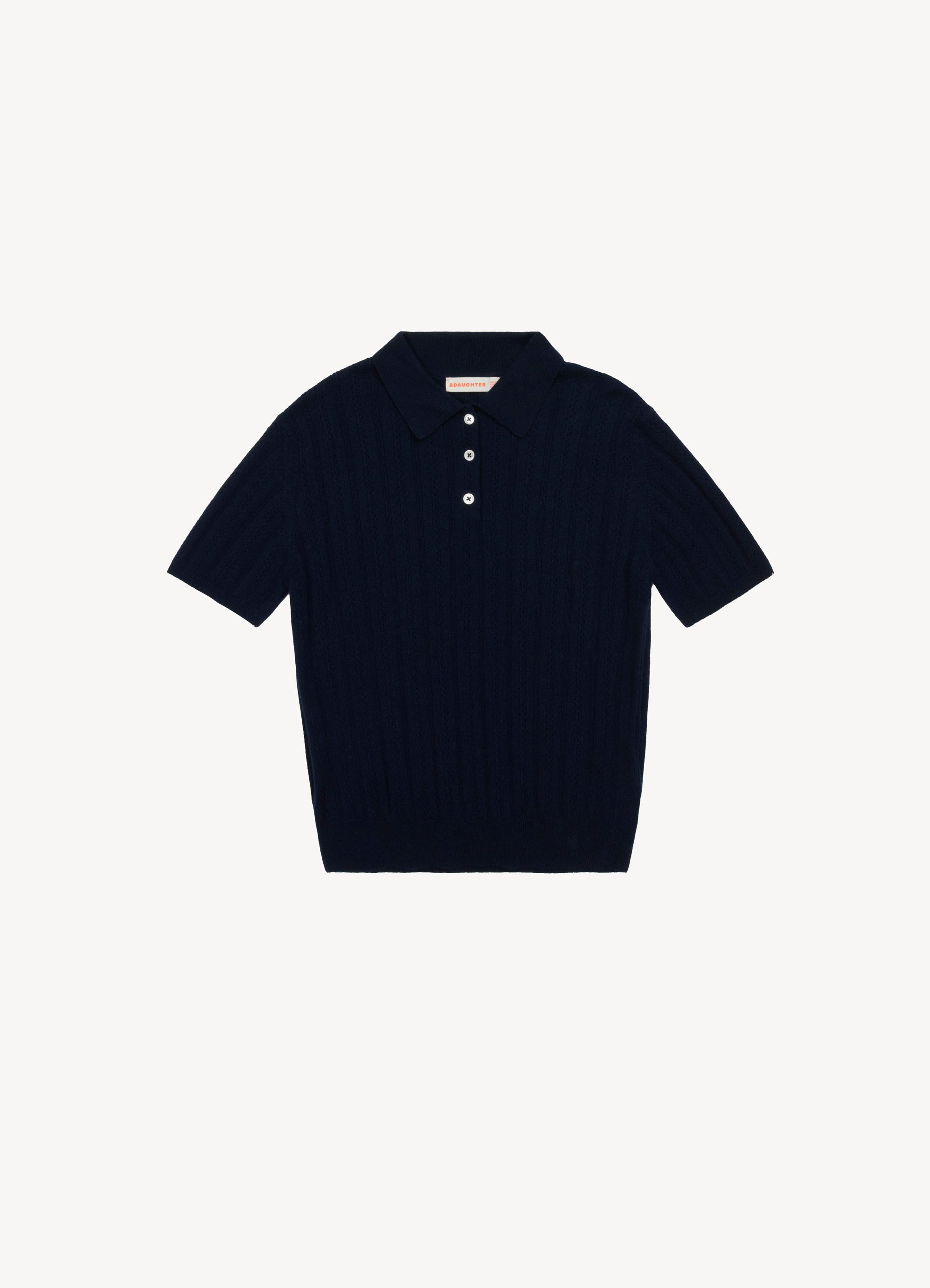 Knitted in a fine 12-gauge pointelle stitch, the silhouette is lightweight and breathable, with short sleeves, a neat collar and a softly draped shape designed for warm-weather layering. Finished with responsibly sourced Trocas shell buttons for a refined, understated finish.