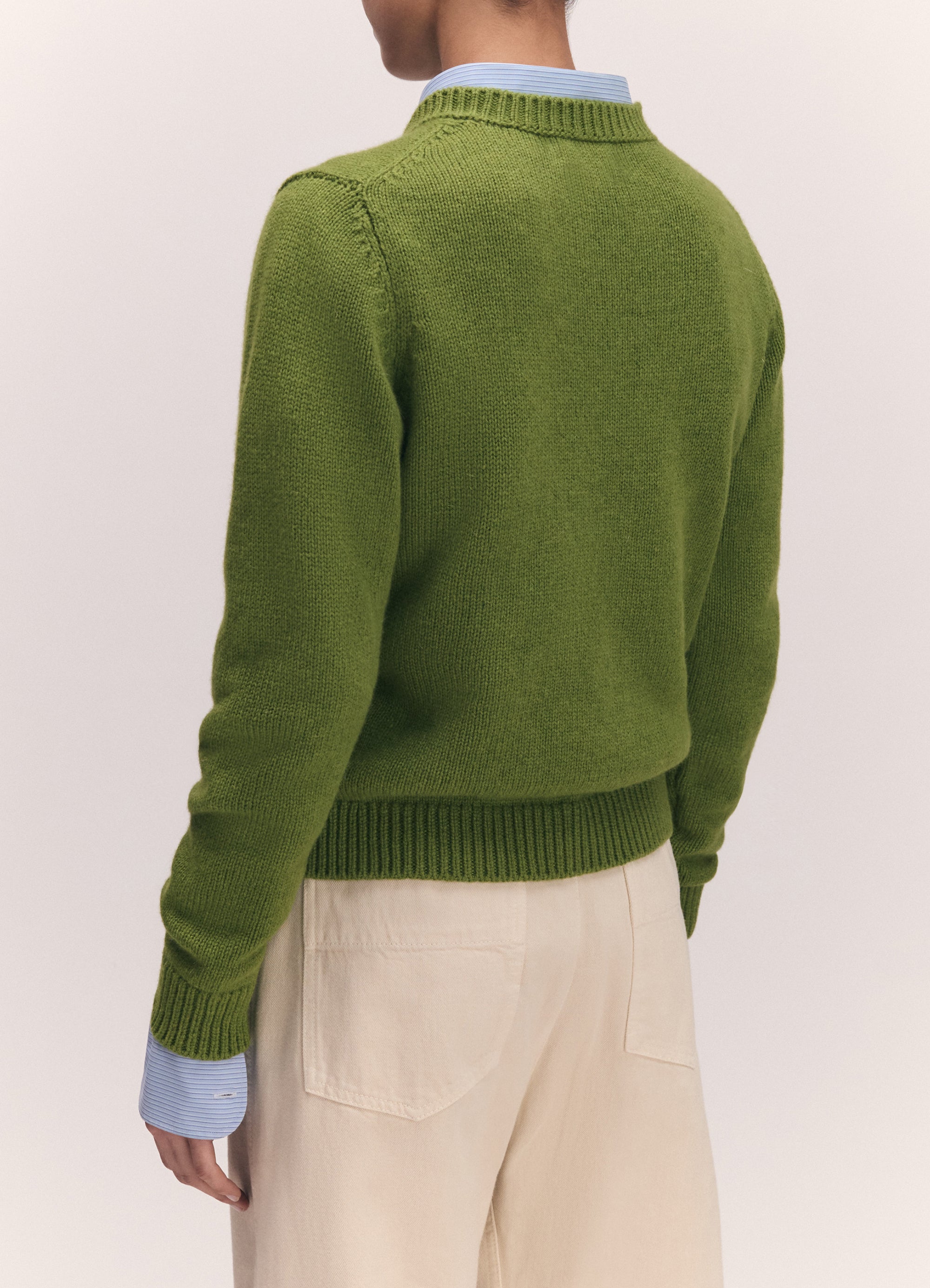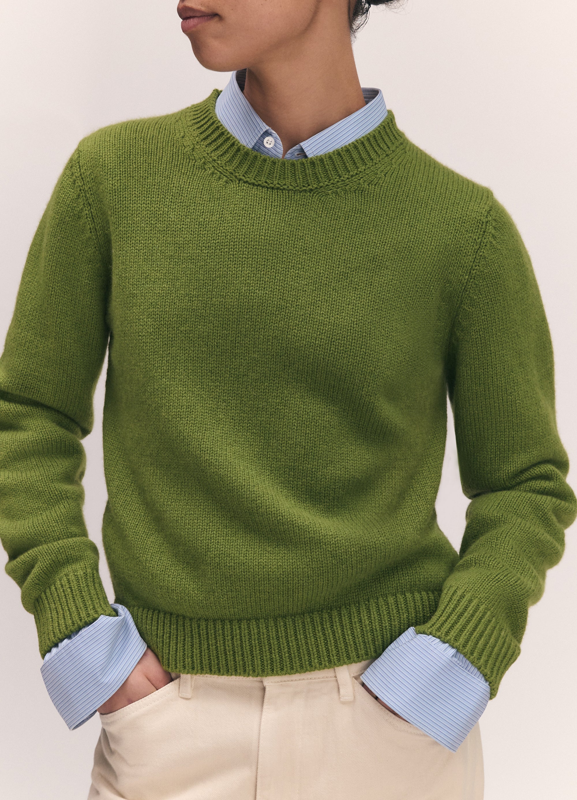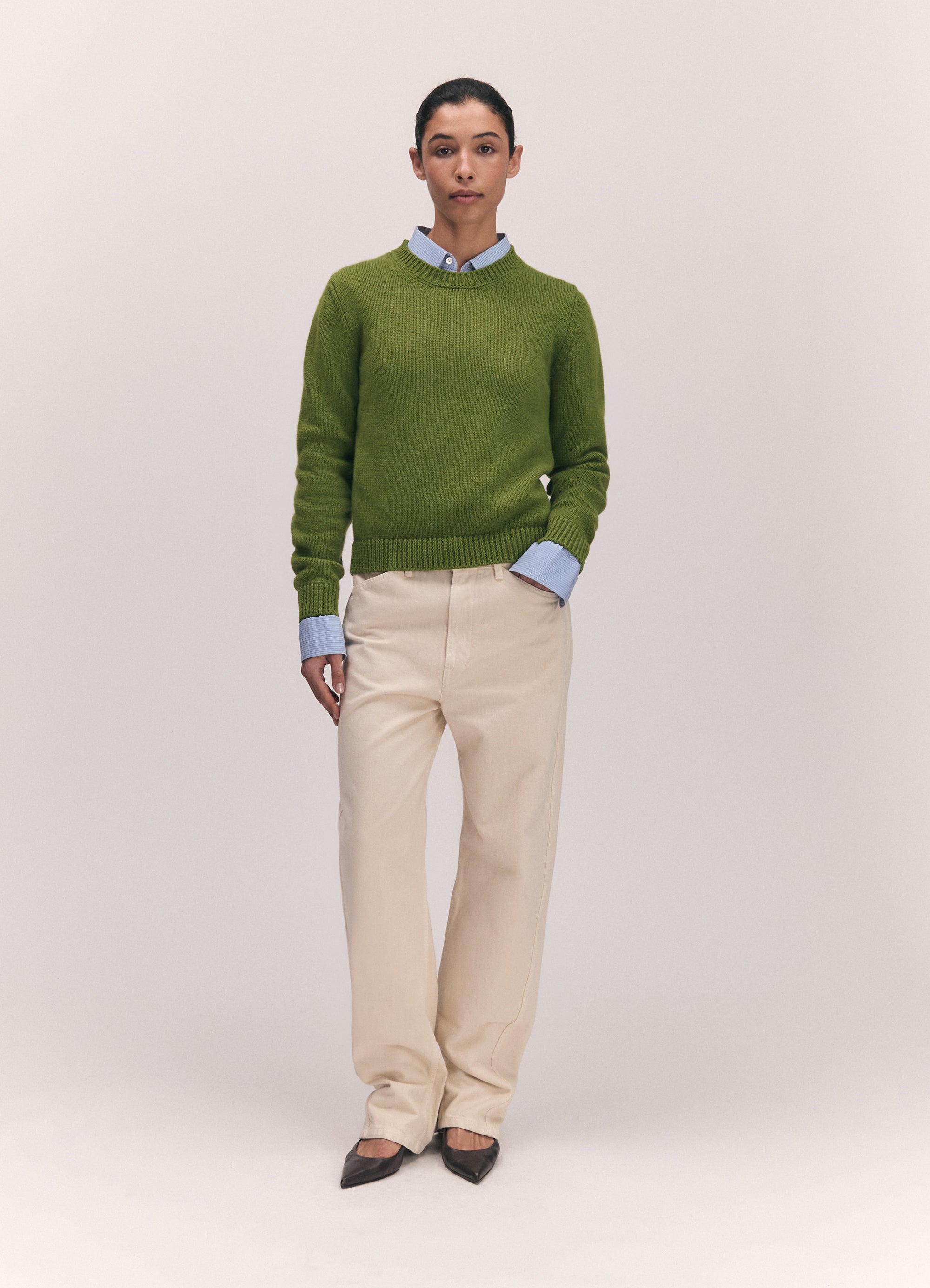 The Rosha Shrunken Crew in super-soft geelong lambswool, a neat, close-fitting take on the classic crewneck sweater. Inspired by traditional knitwear proportions, this style is reworked with a gently modern sensibility and a more compact, feminine silhouette.