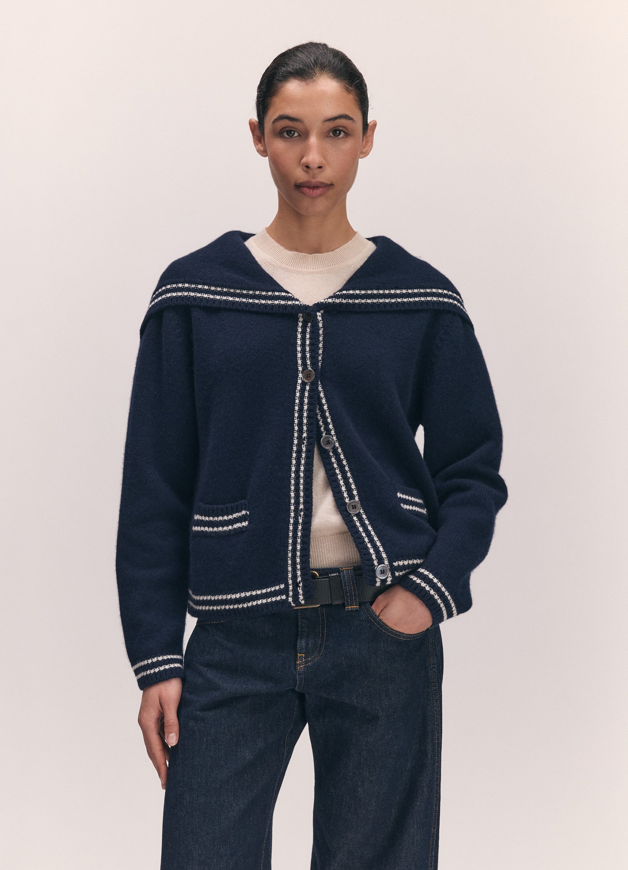 Maya wears the Saoirse Sailor Cardigan in Navy styled with the Emer Cashmere T-Shirt in Canvas.