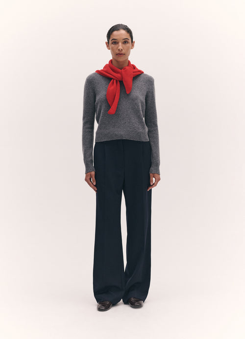 Maya wears the XL Cashmere Foulard in Poppy Red styled with the Sligo Shrunken V-Neck in Derby Grey.